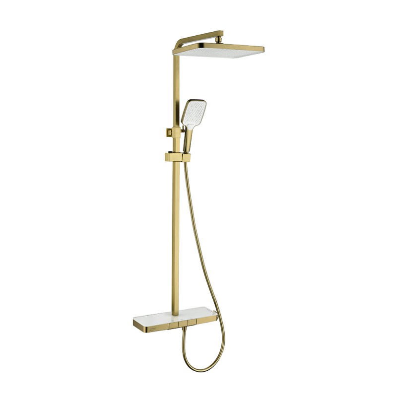 Σύστημα ντουζ τηλεσκοπικό με κώδωνα, τηλέφωνο ντουζ,θερμοστατική μπαταρία και γυάλινο ράφι.