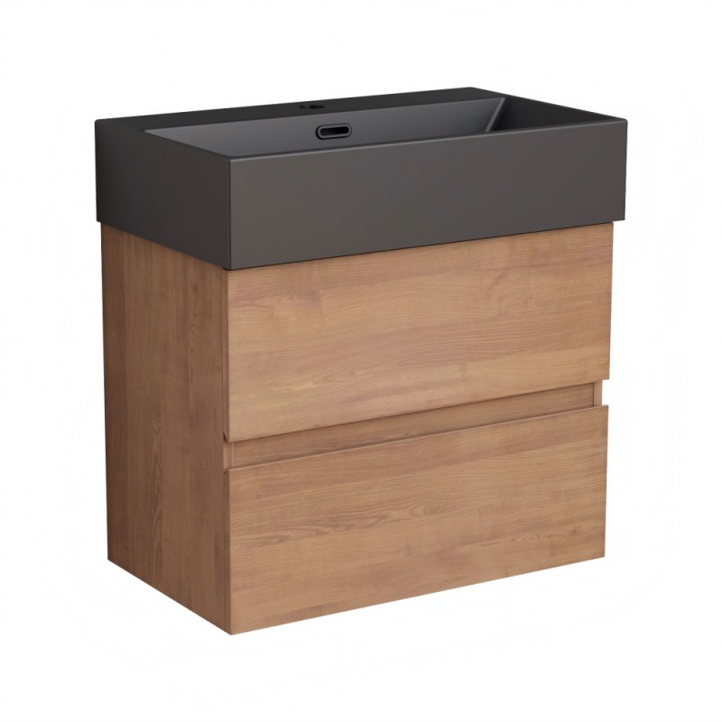Κρεμαστό έπιπλο μπάνιου από PVC με διακόσμηση από ξύλο μελαμίνης (PS001), δύο συρτάρια  με μηχανισμό soft close  και κεραμικό νιπτήρα 6036MB