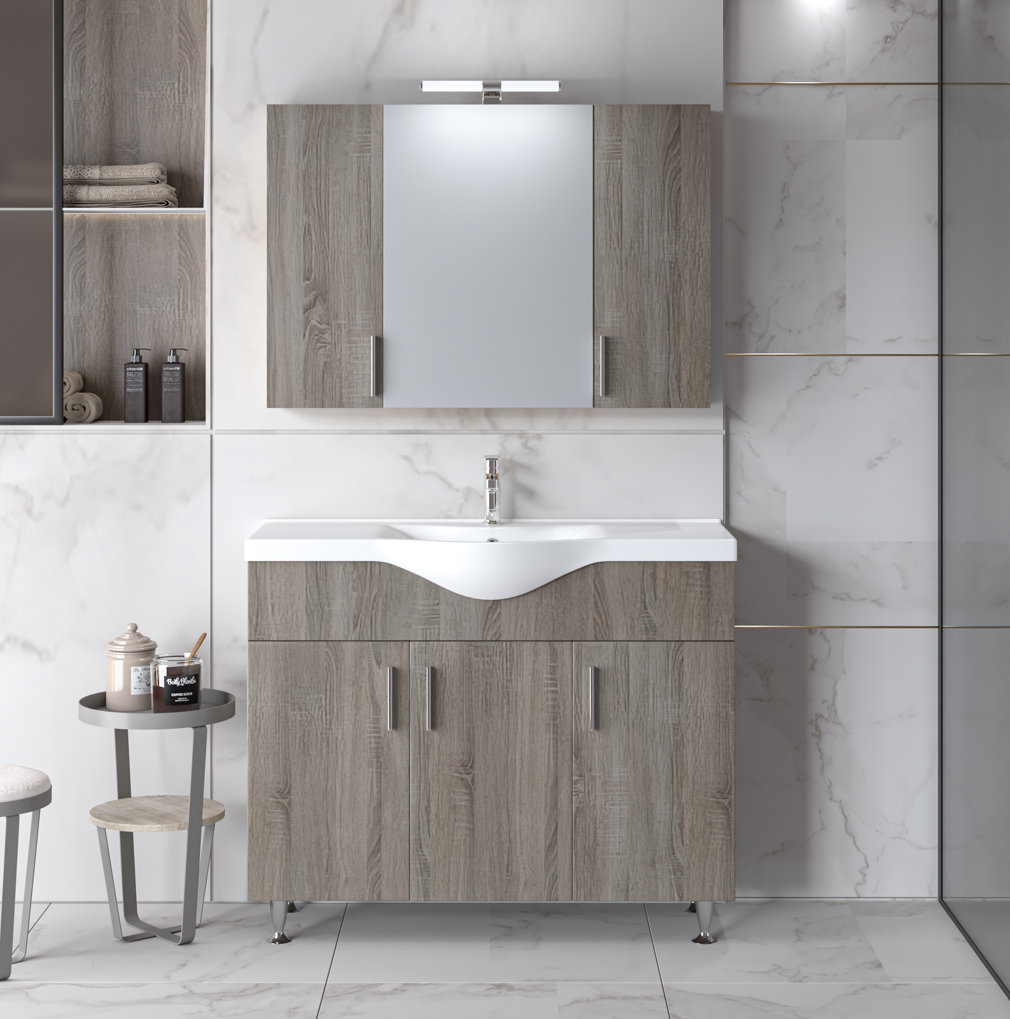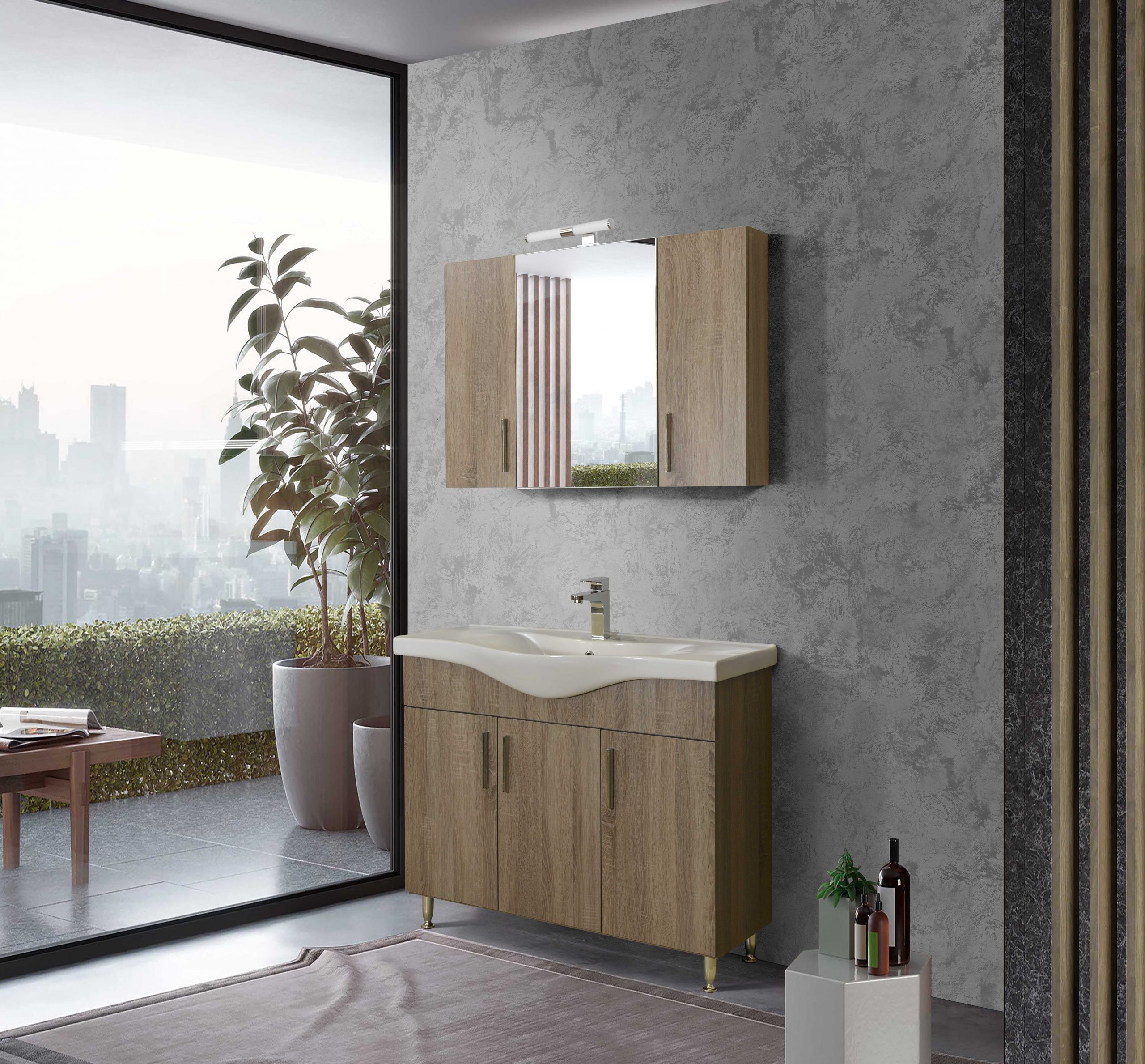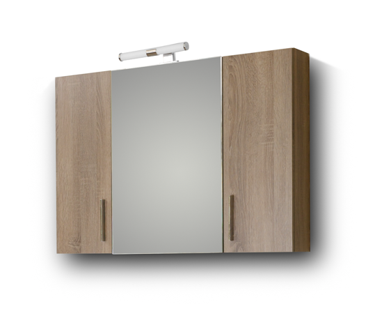 •Καθρέφτης SIENA 95 SONOMA DARK. Περιλαμβάνει πρόσοψη καθρέφτη που ανοίγει προς τα δεξιά και δύο μικρότερες ξύλινες πόρτες στα πλαϊνά μέρη, στον ίδιο χρωματισμό με τον καθρέφτη. Το μικρά αυτά ντουλαπάκια διαθέτουν από ένα ράφι που σας προσφέρει έξτρα αποθηκευτικό χώρο. Το μεγάλο μεσαίο ντουλάπι διαθέτει επίσης εσωτερικό ράφι για την τοποθέτηση των φαρμάκων και αντικειμένων καθημερινής χρήσης.