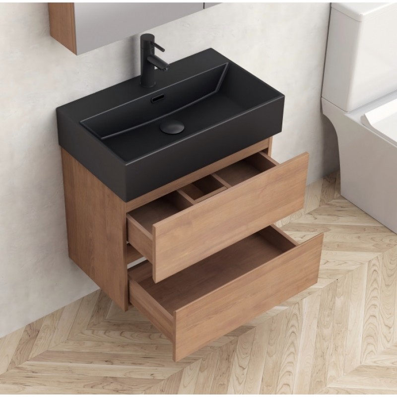 Κρεμαστό έπιπλο μπάνιου από PVC με διακόσμηση από ξύλο μελαμίνης (PS001), δύο συρτάρια  με μηχανισμό soft close  και κεραμικό νιπτήρα 6036MB