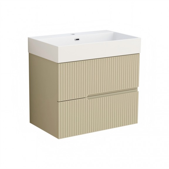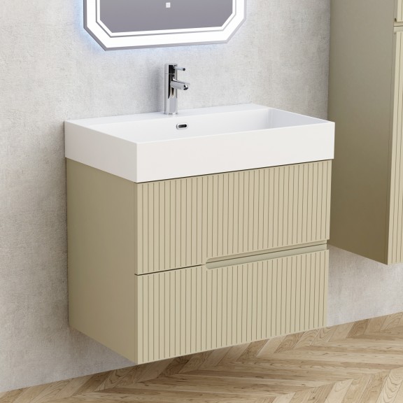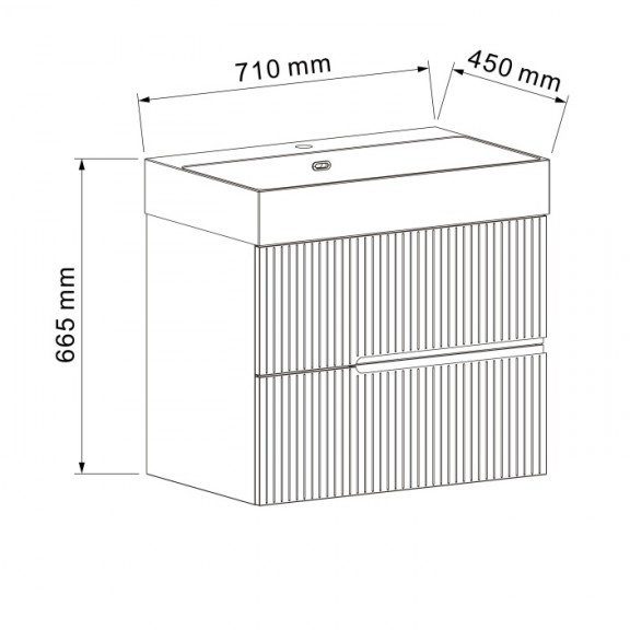 Αυτό το ντουλάπι μπάνιου έχει σχεδιαστεί με δύο συρτάρια και είναι κατασκευασμένο από πάνελ PVC ανθεκτικά στην υγρασία για μακροχρόνια αντοχή. Οι προσόψεις των συρταριών είναι κατασκευασμένες από PVC 18 mm με διακοσμητικό φινίρισμα, το πίσω μέρος είναι από PVC 5 mm και η υπόλοιπη δομή χρησιμοποιεί PVC 15 mm. Διαθέτει συρόμενα συρτάρια DTC με απαλό κλείσιμο για ομαλή και αθόρυβη λειτουργία και ένα πλαστικό σύστημα λαβών σε σχήμα "U". Το ντουλάπι παρέχεται πλήρως συναρμολογημένο. Συνδυάζεται με νιπτήρα ρητίνης με ενσωματωμένη υπερχείλιση και ματ λευκό φινίρισμα.