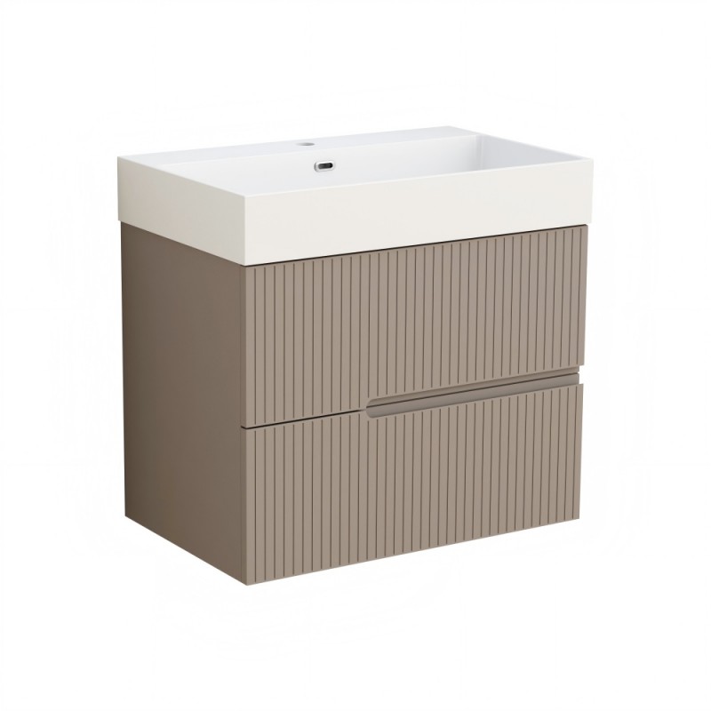 Αυτό το ντουλάπι μπάνιου έχει σχεδιαστεί με δύο συρτάρια και είναι κατασκευασμένο από πάνελ PVC ανθεκτικά στην υγρασία για μακροχρόνια αντοχή. Οι προσόψεις των συρταριών είναι κατασκευασμένες από PVC 18 mm με διακοσμητικό φινίρισμα, το πίσω μέρος είναι από PVC 5 mm και η υπόλοιπη δομή χρησιμοποιεί PVC 15 mm. Διαθέτει συρόμενα συρτάρια DTC με απαλό κλείσιμο για ομαλή και αθόρυβη λειτουργία και ένα πλαστικό σύστημα λαβών σε σχήμα "U". Το ντουλάπι παρέχεται πλήρως συναρμολογημένο. Συνδυάζεται με νιπτήρα ρητίνης με ενσωματωμένη υπερχείλιση και ματ λευκό φινίρισμα.